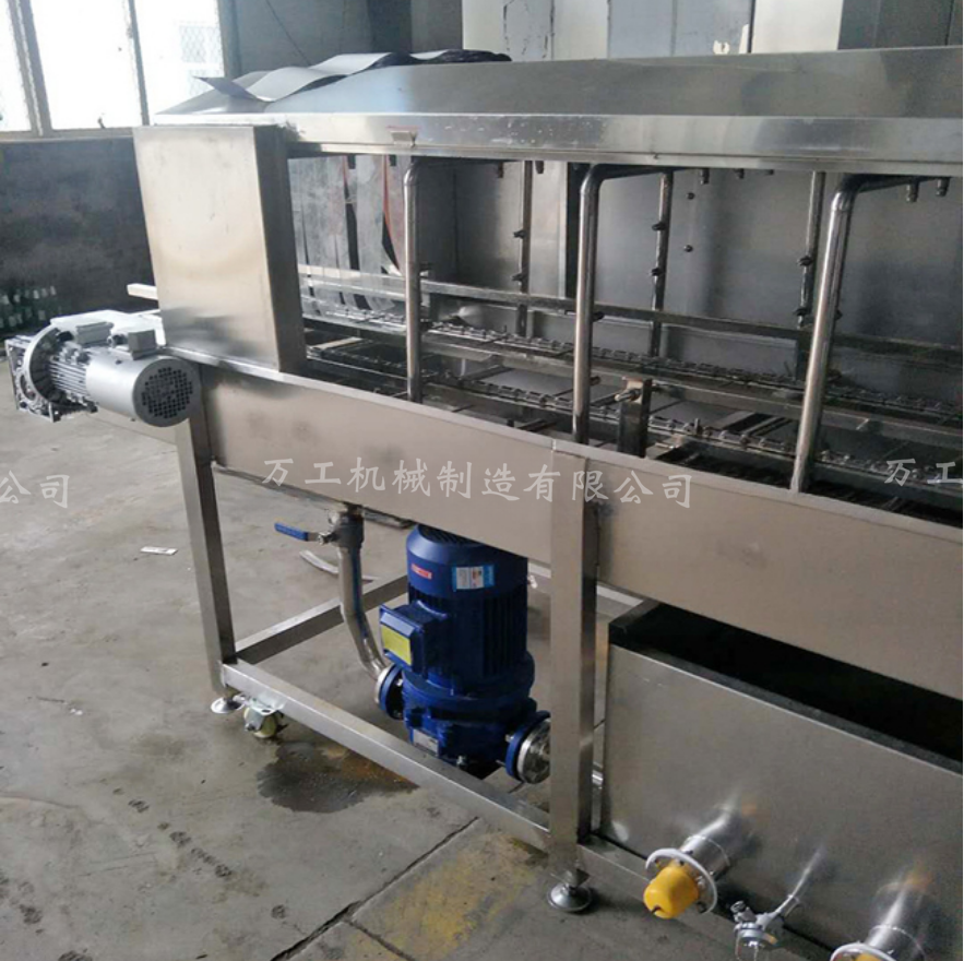 1、洗筐機主要由輸入、預洗、主清洗、漂洗、及輸出部分組成。使用標準組合式清洗系統(tǒng)非常靈活,可根據(jù)用戶的特殊要求進行組合;洗筐機合理的水路設計,達到節(jié)水高效,耗水量僅為500L/小時;預洗水箱、主清洗水箱設有蒸汽加熱及溫控裝置,以便調(diào)節(jié)水溫達到清洗效果;輸送裝置采用變頻調(diào)速,輸送鏈速0.7-7米/分可調(diào)整,以滿足不同條件下的清洗要求;