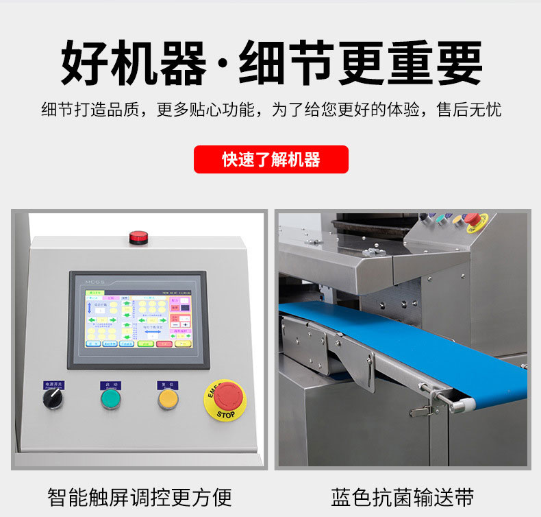 1、 搓餅裝置。餅胚大小改變時(shí),可通過高度調(diào)節(jié)螺絲來改變壓延輥高度,以免餅胚壓延程度大或不足,整形裝置亦有手柄調(diào)節(jié),以保證餅胚搓成圓柱體,以便成型。